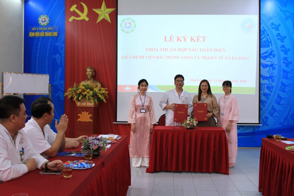 Sáng ngày 14/04/2026 tại Hội trường lớn Bệnh viện Bắc Thăng Long đã diễn ra Lễ ký kết thỏa thuận hợp tác toàn diện giữa Bệnh viện Bắc Thăng Long và Trạm Y tế xã Đa Phúc. Dự buổi Lễ, về phía Bệnh viện có BSCKII Vũ Thành Chung – Giám đốc Bệnh viện, cùng Ban giám đốc và lãnh đạo các khoa/phòng; về phía Trạm Y tế xã Đa Phúc có Bà Nguyễn Thị Huệ – Giám đốc Trạm Y tế xã và đại diện các khoa/phòng chuyên môn. Phát biểu tại buổi lễ, BSCKII Vũ Thành Chung – Giám đốc Bệnh viện, nhấn mạnh: Lễ ký kết là dấu mốc quan trọng trong quá trình nâng cao chất lượng công tác khám, chữa bệnh tại tuyến y tế cơ sở. Thỏa thuận hợp tác tạo điều kiện để Bệnh viện Bắc Thăng Long và Trạm Y tế xã Đa Phúc tăng cường năng lực chuyên môn, phát huy hiệu quả nguồn lực sẵn có, qua đó cung cấp cho người dân các dịch vụ y tế an toàn, kịp thời và chất lượng. Theo nội dung thỏa thuận, hai bên xác lập một cơ chế phối hợp chặt chẽ, liên tục và linh hoạt. Trọng tâm là xây dựng Trạm Y tế xã Đa Phúc trở thành địa chỉ tin cậy trong việc sàng lọc, phát hiện sớm và quản lý hiệu quả các bệnh không lây nhiễm như tăng huyết áp, đái tháo đường, đồng thời xử trí tốt các ca cấp cứu ban đầu. Điểm nổi bật trong nội dung hợp tác lần này là chiến lược đào tạo và chuyển giao kỹ thuật theo lộ trình khoa học. Bệnh viện Bắc Thăng Long cam kết cử đội ngũ bác sĩ chuyên khoa giàu kinh nghiệm thuộc các lĩnh vực Nội khoa, Ngoại, Sản, Nhi, Tai Mũi Họng, Răng Hàm Mặt, Mắt, Y học cổ truyền… hỗ trợ Trạm Y tế xã Đa Phúc . Thông qua sự hợp tác này, người dân xã Đa Phúc sẽ được thụ hưởng các dịch vụ y tế tốt hơn, từ công tác dự phòng, tầm soát sớm bệnh tật đến điều trị và theo dõi sức khỏe định kỳ. Đây là nền tảng quan trọng góp phần xây dựng hệ thống y tế cơ sở ngày càng vững mạnh, thân thiện, đáp ứng tốt hơn nhu cầu chăm sóc sức khỏe của nhân dân. Một số hình buổi Lễ ký kết Thỏa thuận: Phòng CTXH